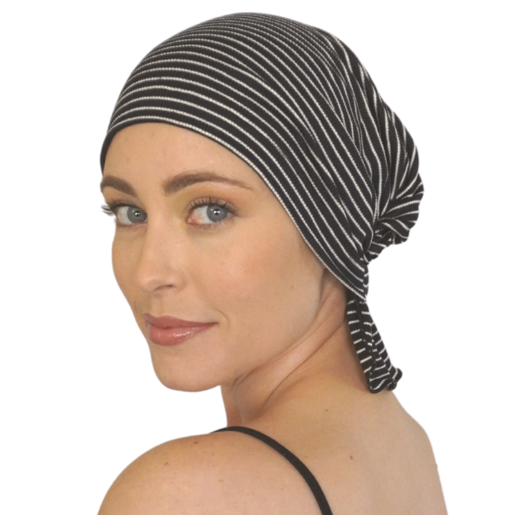 Navy/White Striped Soft Jersey Knit Signature Slip-On beanie adds feminine volume, producing the subtle look and feel of having hair. The unique elastic design stretches for a comfortable and easy fit. Slips on and off with ease; No tying necessary. Our patented design features a fluent fabric flap for a polished look that provides full coverage around the nape of the neck. Chemo Beanies® ends the search for the perfect fashionable fit and allows women to spend precious time focusing on their healthcare, not their headwear. The idea came while the founder was going through cancer. All she could find were boring, old-fashioned chemo head covers and chemo caps that looked like they had been found in her grandmother's closet.